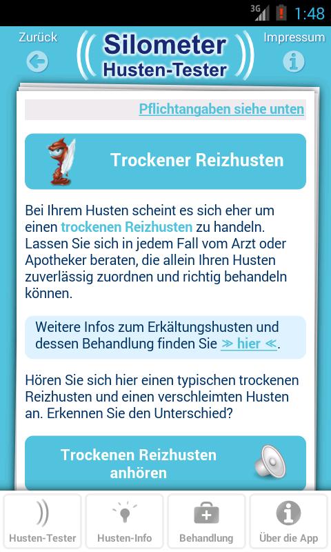 Der Hustengeplagte muss nur mehrmals in das Mikrofon seines Smartphones husten, danach analysiert die speziell programmierte Software die Hustengeräuche und gibt eine erste Einschätzung, ob es sich eher um einen trockenen Reizhusten oder eher um einen produktiven Husten handeln könnte. Die Diagnose durch den Arzt oder die Beratung in der Apotheke kann das Silometer Testergebnis selbstverständlich nicht ersetzen. Nur Arzt und Apotheker allein können den Husten zuverlässig zuordnen und behandeln.